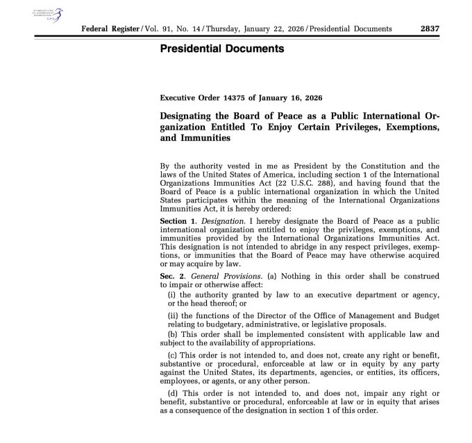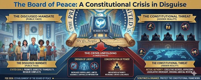 03/25/2026 The Founders’ Observations on the “Board of Peace” and the Present State of the Union By Publius – Writing from the spirit of 1787, discovered in the year 2026 To the People of the United States: Having been transported, as it were, from our own time to this year of 2026, we have been shown two instruments that purport to govern the relations of the American republic with the wider world: an Executive Order 14375, signed by one who styles himself “President,” and a document called the “Charter of the Board of Peace.” We are told that this Board is to be a “public international organization,” endowed with legal personality, privileges, and immunities, and that the United States is to participate therein. We confess that upon first reading, we rubbed our eyes in disbelief. For if we understand aright the compact we drafted, the Constitution for the United States of America, then such a creation as this Board finds no warrant in that instrument, and indeed strikes at the very roots of republican form of government. We therefore set down our thoughts, that the present generation may judge for themselves whether they remain a free people, or have suffered themselves to be bound by chains not forged by their own consent. I. The Nature of the Compact Let us begin with first principles. The Declaration of Independence, which we signed, asserts that governments derive their just powers from the consent of the governed. This is not a mere flourish; it is the cornerstone of all legitimate authority. When we later drafted the Constitution, we did not create a national government that would rule over the people directly in all things. Rather, we established a federal compact, a limited government of enumerated powers, leaving the mass of sovereign authority with the several States and, ultimately, with the people themselves. The Tenth Amendment, which we insisted upon, makes this explicit: “The powers not delegated to the United States by the Constitution, nor prohibited by it to the States, are reserved to the States respectively, or to the people.” Now, where in that Constitution is there a delegation of power to create a “public international organization” with legal personality, capable of entering into contracts, acquiring property, employing staff, and immunizing itself from the jurisdiction of the States? The answer is: nowhere. The President is given the power to make treaties, but only with the advice and consent of the Senate, and only such treaties as are consistent with the Constitution. The Congress is given power to define and punish offenses against the law of nations, and to regulate commerce with foreign nations. But neither branch is given authority to create a new sovereign that stands above the States and above the people, and that operates by its own rules, free from the checks and balances we so carefully devised. II. The Executive Order: A Power Nowhere Granted Executive Order 14375 purports to designate the Board of Peace as a “public international organization” entitled to certain privileges, exemptions, and immunities, pursuant to the International Organizations Immunities Act. We are not familiar with that statute, but we are told it was enacted long after our time. Let us suppose, for the sake of argument, that such a statute exists. The question remains: By what authority did Congress pass such a law? For if the Constitution does not grant the power to create or recognize international organizations with legal personality, then any statute purporting to do so is ultra vires, beyond the power of Congress, and void. Moreover, the Executive Order itself reveals a startling truth: the President alone, without any involvement of the Senate or the House of Representatives, has determined that the United States shall participate in this Board. He has done so by the stroke of a pen, invoking a statute that (we are told) authorizes such designations. But this is governance by edict, not by law. In our understanding, the President’s duty is to “take care that the laws be faithfully executed,” not to make new law, and certainly not to bind the nation to international engagements without the consent of the people’s representatives. Consider what Blackstone wrote: “In all tyrannical governments, the supreme magistracy, or the right of both making and of enforcing the laws, is vested in one and the same man, or one and the same body of men; and wherever these two powers are united together, there can be no public liberty.” Here, the President alone has both made the determination to participate (a legislative act) and executed that determination (an executive act), with no check from the judiciary and no role for the legislature. This is precisely the union of powers we sought to prevent. Charter of the Board of Peace (16 January 2025) III. The Charter: A Constitution Without a People Turning to the Charter itself, we find a document that purports to create an organization with all the trappings of sovereignty, yet utterly lacking in the one thing that makes sovereignty legitimate: the consent of the governed. The Board of Peace consists of “Member States,” but these are not the sovereign States of our Union. They are entities invited by a Chairman, subject to his pleasure for renewal of membership, removable at his discretion, and bound by a charter that makes the Chairman the “final authority regarding the meaning, interpretation, and application” thereof. There is no provision for the people of any nation to have a voice in this Board’s affairs. There is no bill of rights, no protection for individual liberty, no guarantee of trial by jury. There is only the will of the Chairman and the votes of Member States, votes that can be overridden by the Chairman’s veto. Let us examine the governance structure more closely: Article 3.2 establishes Donald J. Trump as the inaugural Chairman, and provides that he shall “separa